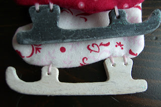 Nämä luistimet ovat pienimmät Tilda-luistimet. Ommellut osat ovat olleet valmiina ainakin viime keväästä saakka, mutta vasta viime viikolla sain aikaiseksi maalata sopivat terät. Ja maaleja ottaessani esille huomasin, että toinen valkoinen ei olekaan valkoista vaan läpinäkyvää kimalletta. No, eihän värit ole olleetkaan mulla kuin n. vuoden ;O)
