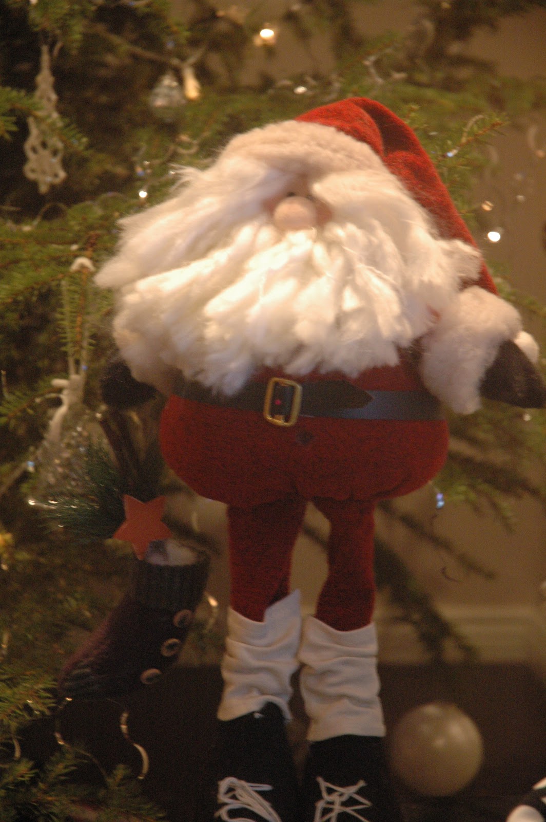 Pää pellavaa, vartalossa puuvillaa, kädet ja jalat villakangasta (Tilda). Vantuissa lukee god jul ja tonttupoika. Täytteenä käytin mm. yhden tyynyn päälisineen ja alavartaloon jopa sanomalehteä (söi niin plajon vanua että huh, ja en ajatellu pestä ukkoa).